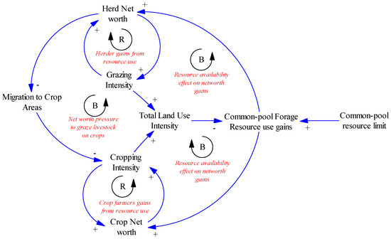 Causal Loop Diagram representing the Dynamic Hypothesis of Tragedy of the common-pool resources in the Nigerian Uplands. The variables influencing the cattle grazing activities are shown above. Each arrow head is accompanied by a ‘+’ or a ‘−‘. an arrow with a ‘+’ denotes that the variable is expected to change in the same direction, while a ‘−’ changes in the opposite direction. As an example for a ‘+’ arrow; as common-pool resources increase, herder’s net worth also increases, whereas for a ‘−’, as the total activity increases, common-pool resources decrease. The ‘B’ at the center of the loop denotes a balancing or a negative feedback loop in which a change in one variable feeds back to balance out or oppose the effect of the initial change. The ‘R’ denotes a reinforcing or positive feedback loop in which a change in one variable feeds back to reinforce or support the initial change. The common-pool resource availability increases both crop and herder’s net worth, but their combined activity reduces the available common-pool resources. To compensate, herders migrate to cropping areas to graze and increase their net worth as resources are depleted, thereby reducing the crop activity and weakening farmers’ ability to recover net worth.