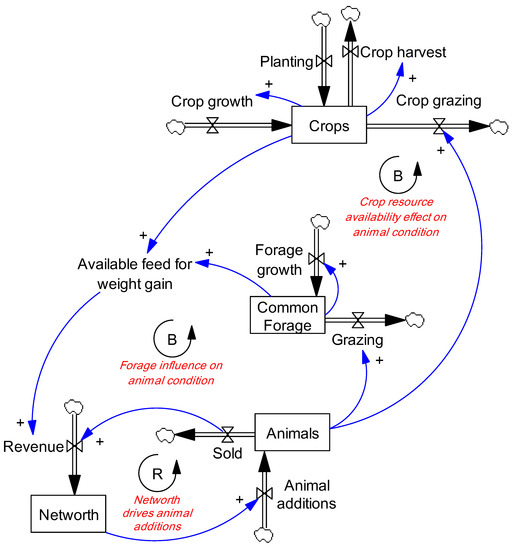 A system dynamics (SD) modeling approach was used to represent the key feedbacks between the smallholder herders’ total grazing animals, herders’ economic status, common forage availability, and the interaction between livestock and croplands in northern Nigeria. The models are mathematical representations of the mechanisms governing natural phenomenon that are not easily understood or managed [46,47]. This approach has been used in previous agricultural systems research, including natural resource, livestock production and grazing management problems [15,27,47,48,49,50,51,52,53,54], as well as Nigerian beef supply problems [55]. A mathematical SD model was constructed in the Vensim® modeling environment (Ventana Corp., Harvard, MA, USA) to link common forage, animal population, crops and the net worth of herders (stylized in Figure 2). The model time-step was one month (with a dt = 0.25), while the time horizon of the simulation was 50 years. A time-step of one month was chosen due to the seasonal variability in forage production and livestock grazing activities. The model was divided into four separate yet highly cohesive sections: common-pool forage dynamics, animal herd dynamics, crops dynamics and financial net worth. We followed an SD modeling process which will be described in detail in the following sections: (1) defining the objectives and dynamic hypothesis formation; (2) constructing the mathematical model; (3) model calibration for internal and behavioral consistency; (4) testing and evaluating alternative management strategies or policies aimed at resolving the problem.