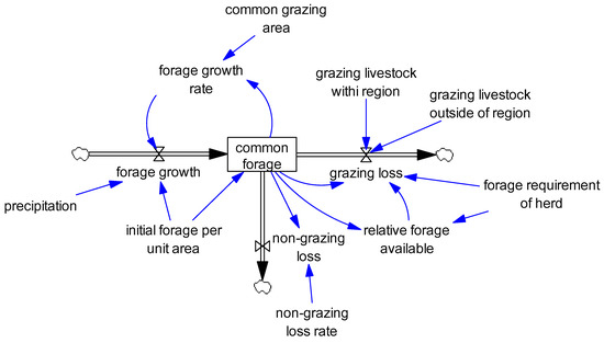 Forage resource dynamics (Figure 3) were characterized by the stock of common forage (initial forage per hectare = 400 kg), a function of forage growth, grazing loss and non-grazing loss. Contemporary research estimates of forage productivity and availability in this region are not available; therefore, we used data from a management study in northern Nigeria [37]. Monthly forage growth was a function of forage growth rate (a table function using the input common forage), initial forage per unit area and precipitation (normalized to mean precipitation = 1, a dimensionless scaler). The larger the stock of common forage, the slower the forage growth rate. If precipitation was lacking, the forage growth was reduced or stopped. In the case that common forage was reduced to zero (which mathematically precluded subsequent forage growth), the stock would be reset back to the initial forage per unit area when grazing loss stopped. Forage losses included grazing, where animal stocks were moved to graze on common forage according to the forage requirement of the herd and the relative forage available, and non-grazing losses (e.g., natural plant senescence).