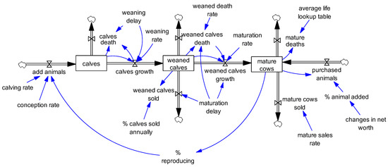 A synthesized stock-flow model representing the cow herd dynamics in the model.