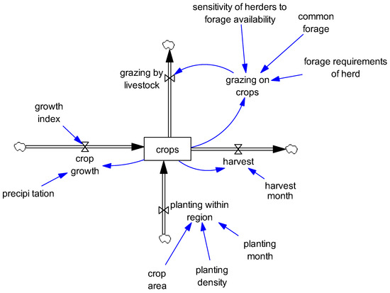 Crop production is performed in both the northern Nigerian uplands and the southern region by crop growers. Nigeria’s land tenure systems enable farmers to occupy or hold some area of land for farming activities. The Nigerian government does not have proper demarcation between the grazing land and the crop production land [37]. The farmers’ land holdings are also not demarcated or fenced to prevent intruders from grazing on crops. The crop growers in Nigeria practice subsistent farming, where manual tools are used in their cropping activities [33]. At the beginning of the crop production year, the crop stock (Figure 5) is accumulated by means of planting; planting is a function of the planting density and planting month. The plant growth is calculated by multiplying crops by growth index and scaled by precipitation forcing. Crops diminish by means of harvesting, where harvesting is calculated by multiplying crops by harvesting rate at the harvest month; grazing by livestock is a function of the crops available and forage requirements of the herd.