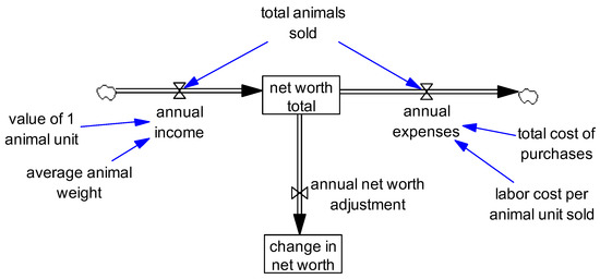 The model’s financial component (Figure 6) captures changes in net worth given changes in livestock production. The central stock of the financial component is the net worth total (i.e., annual income minus annual expenses). The cash inflow (i.e., annual income) results from the total number of total animals sold (the sale of weaned calves and mature cows). Each unit of animals sold is multiplied by the value of one animal unit’s weight and the average animal weight to generate the annual income. The annual expense (i.e., cost of production) is calculated by multiplying total animals sold by labor cost per animal unit sold. The labor cost per animal unit sold is calculated by multiplying the average animal life by the labor per animal month (i.e., labor scaled by the total animal). There is no additional feed cost or transportation cost associated with livestock production due to the nomadic movement of cattle to common-pool forage or to supplement herds during times of forage depletion by grazing on the croplands of farmers. The model integrates net worth (income minus expenses) on a monthly basis. Net worth influences the forage requirement of the herd by driving the rates of change in livestock sales and purchases which alter the total number of grazing animals.