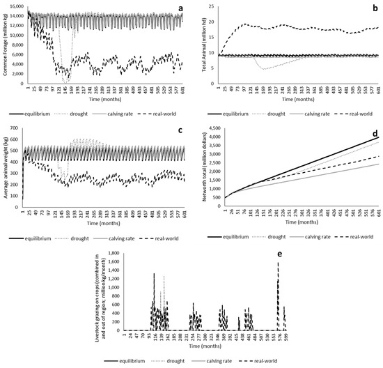 Behaviors-over-time plots for the common forage panel (a), total animals panel (b), average animal weight panel (c), net worth total panel (d) and livestock grazing on crops (both in and out of the region; panel (e) for each calibration run (equilibrium, drought, calving rate reduction and replication of real-world behaviors).