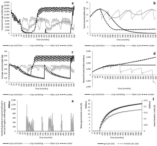 Behaviors-over-time plots for the common forage panel (a), total animals panel (b), average animal weight panel (c), net worth total panel (d), livestock grazing on crops (both in and out of the region) panel (e); for each policy-test (implementing crop restrictions, instituting crop marketing, increased labor costs and the combination strategy of market integration for funding rangeland improvements), as well as mean program costs to the government and to herders for the combination policy-test only panel (f).