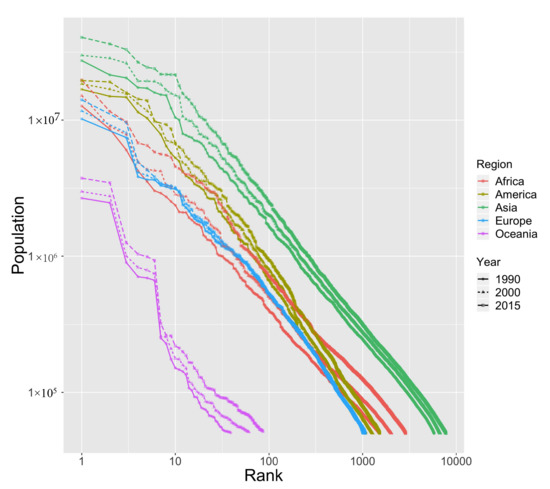 - Decker, E.H.; Kerkhoff, A.J.; Moses, M.E. Global patterns of city size distributions and their fundamental drivers. PLoS ONE 2007, 2, e934. [Google Scholar] [CrossRef] [PubMed]