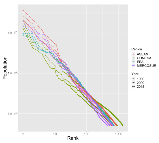We also study the rank-size properties by grouping the countries into trade areas, which are supposed to capture subsystems with a higher level of interurban interactions. We show the temporal evolution of rank-size plot in Figure 2, and corresponding statistics in 2015 in Table 3. Although the trade areas considered highly overlap with continents (in particular, for EEA with Europe and ASEAN with Asia), the exponents obtained are different from the previous ones, and closer to one. According to the authors of [67], varying the definition of cities yield varying Zipf exponents, with no endogenous privileged definition. We can indeed expect the same when varying the system of cities considered, as [68] show that power-law are not valid anymore when considering the tail of the distribution, i.e., changing the number of cities included in the estimation. If Zipf’s law was a pure product of ergodic stochastic processes without any interactions between cities, randomly sampling a subset of a given system should yield roughly the same exponent (at least with large sample size and with an OLS estimator). Although the sampling is not random here (a more elaborated statistical analysis remains for future work), the discrepancy suggests the opposite of the previous case. Therefore, it means that urban systems are highly non-ergodic and that interactions between cities are crucial. We suggest that the exact same phenomenon occurs for urban scaling laws, as they are, in the same way, strongly dependent to system definition [69,70], and that the claims of universality by the mainstream scaling literature are at least not compatible with this empirical evidence, at worse inaccurate in terms of underlying dynamical processes.