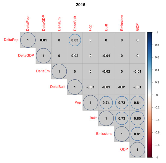 Correlations between GHSL indicators (GDP, Emissions, Built-up surfaces, Population and their evolution 2000–2015 (Delta)).