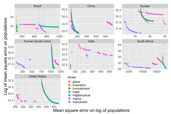 We show in Figure 5 how different dynamic models succeed in simulating the population trajectories of all cities for BRICS countries, Europe, and the United States. Here, each model is adjusted on the GeoDiverCity dataset for each system of cities, for time spans covering 1960 to 2010 (precise dates depend on each system). Evaluating models on this dataset rather than on the GHSL database seems more relevant for these systems of cities, as data was specifically tailored for comparability and following a consistent geographical definition of urban areas with more refined estimation of their populations [13]. The model calibration procedure is the following. Cities are initialized with observed population at the first date in the dataset. Given a model and associated parameter values, populations are then simulated for each date in the dataset according to the model. The fitness is evaluated with two complementary indicators: (i) the logarithm of the total mean square error between observed and simulated populations, taken in time and for all cities, and (ii) the mean square error on logarithms of observed and simulated populations taken in time and for all cities. These two indicators are complementary, because of the hierarchical nature of urban systems: considering only the mean square error will favor the adjustment on very large cities only, while considering logarithms of population will put a higher emphasis on the role of medium-sized and small cities, which must not be neglected when considering an urban system [75,76]. A multi-objective calibration algorithm (more precisely, the NSGA2 algorithm), implemented in the OpenMOLE platform with a specific design to be distributed on a computation grid [77], was run with these two objectives for each city system and each model. The algorithm is stopped after a fixed number of steps, for which convergence was always obtained (in the sense of negligible variation in the final populations obtained).