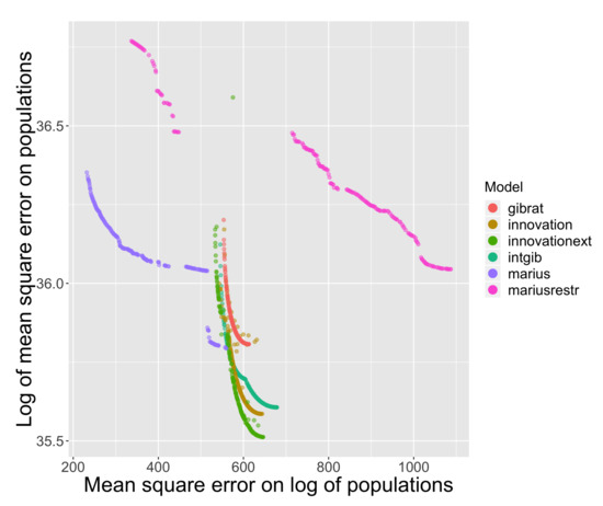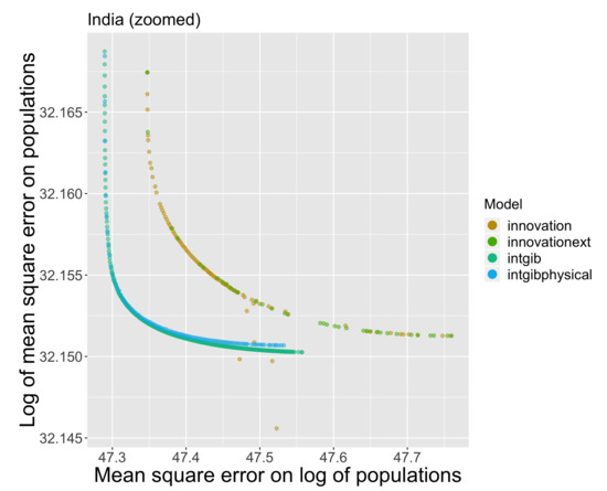 For Brazil (Figure 7), the pattern is more complicated because multiple factors differentiate urban trajectories. The Pareto front is formed by the full Favaro–Pumain model (innovationext, dark green). The innovation model is always the best whatever the city size considered, which could be consistent with the historical and geographical context of Brazil: innovations spilling out of the newly founded Brazilia should necessarily have impacted surroundings medium-sized towns. However, we also obtain the physical interaction model (intgibphysical, light blue) within the zoomed windows as a second Pareto front. This can be interpreted as also a good explanatory power for spatial interactions taking into account the physical terrain. In that sense, the uneven topography of Brazil must play a role in shaping transportation networks and urban interactions, which is consistent with inequalities in extraction potential, in particular for agriculture.