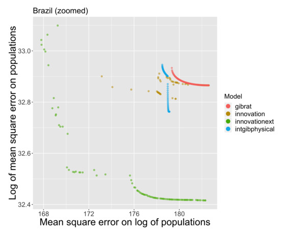We give more details on these cases where different models appear to be complementary. Figure 6 and Figure 7 represent contrasted patterns of the Pareto fronts in the case of India and Brazil. In the case of India, for the models shown here, Gibrat’s model provides the worse predictions of urban trajectories, whatever their position in the urban hierarchy. Obviously introducing interactions, and especially physical interactions, is a necessary and major improvement for simulating the development of Indian cities of all sizes. The interaction model and its physical version (blue and light green) are the best but very close to the full innovation diffusion Favaro–Pumain model (dark green). In that case, the two processes are equivalent candidates to explain urban growth. Note that we show here a zoomed region of the previous plots in Figure 5, and that in that case the Marius economic model is outside the plot range, even dominated by the one-parameter Gibrat’s model. Several explanatory factors for this dominating role of spatial interactions in the Indian system of cities could be proposed, such as a history of a stratified urbanization due to successive colonial extraction periods, but also the capture of a long-distance trade, which spans beyond the boundaries of India or its current insertion within globalized value chains.