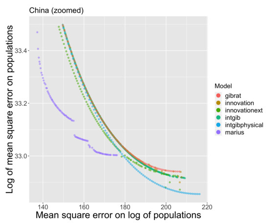 The case of Chinese cities is interesting, not only because of the peculiarities of the urbanization process in this rapidly urbanizing country still with a very old system of cities for half a century [78], but also because the complication of local sources of territorial information about urban populations [62,79]. What emerges from Figure 8 that represents the fitness of dynamic models is a striking quasi-equivalence between all models considered, except for the Marius model (purple) which slightly dominates the other Pareto fronts when medium-sized cities are privileged. Otherwise, all models are very close to the Gibrat’s model (red). Such an “anomaly” when compared to the simulations made on all other regions of the world can be interpreted to be produced by the systematic character of the Chinese urban planning aiming at developing urban areas in a parallel way all over the Chinese urban regions. Models introducing spatial interaction produce patterns expected when geographical bottom-up processes of interaction are considered only, but they cannot anticipate highly top-down planned urban development actions.