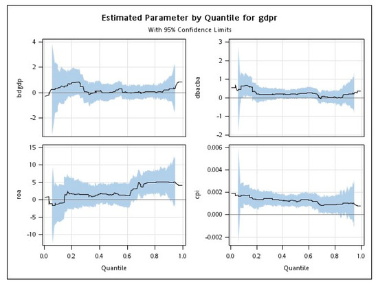 Table 5 presents the regression results of the QR method at the 50th percentile, which are similar to the estimate from the OLS method. The results indicate that the coefficient of the ratio of deposit money bank assets to total bank assets (dbacba) is 0.2689 and the t-value is 2.05. Therefore, the ratio of deposit money bank assets to total assets of financial institutions is positively related to economic development. These empirical results are consistent with Fu et al. [3], Levin et al. [4], and Odedokun [5]. In addition, Table 5 reveals that the coefficient of education level (edu) is −0.0007 and the t-value is −1.85. The empirical result of education level in QR is statistically significant and indicates a negative value. That is, education level is negatively related to GDP growth. Again, the empirical result of education level shown here is not considered common knowledge, showing that an increase in education level is positively related to economic growth.