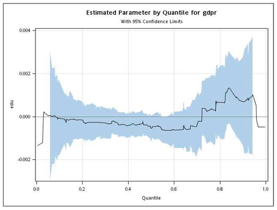 To further examine whether the impact of financial intermediary development and education levels on economic growth have different outcomes on different groups with different income levels, we next focus on the entire conditional distribution of the independent variable (i.e., the GDP growth rate) by figure analysis. Figure 1 presents empirical results, where the shaded bands on the graphs represent 95% confidence intervals and the curves represent the QR results. According to the GDP growth rate (gdpr) of each country, high-income countries possessing low and stable economic growth have a lower rate of economic growth, whereas low-income countries with fast and volatile economic growth are considered have a higher rate of economic growth. Therefore, high-income countries are in the low-conditional quantile of the GDP growth rate, whereas low-income countries are in the high-conditional quantile of the GDP growth rate.