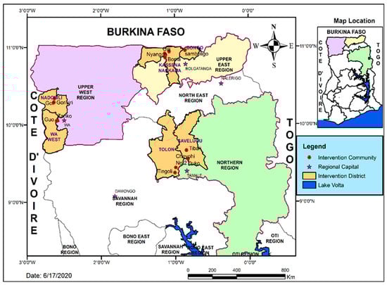 On-farm experiments were conducted in the Northern (Cheyohi No. 2, Tingoli, Duko, and Tibali communities), Upper East (Samboligo, Nyangua, Gia, and Bonia communities), and Upper West (Zanko, Guo, Goli, and Goriyiri communities) regions of Northern Ghana during the 2016, 2017, and 2018 cropping seasons (Figure 1). These regions have a mono-modal rainfall pattern with a 10-year (2007–2016) average annual rainfall of 1122, 927, and 817 mm, respectively [12]. The mean monthly temperatures for the three regions are high throughout the year, with mean monthly figures of 25–38 °C for minimum and maximum temperatures, respectively. The top soil (0–20 cm) properties of the experimental sites varied in texture (loam–sandy loam), pH (5.6–6.3), total nitrogen (0.5–0.9 g/kg), and organic matter (9.5–16.7 g/kg) for the Northern region; texture (loamy sand–sandy loam), pH (5.3–6.4), total nitrogen (0.3–0.4 g/kg), and organic matter (7.1–12.9 g/kg) for the Upper East region; texture (sandy loam–loamy sand), pH (6.2–6.7), total nitrogen (0.8–1.5 g/kg), and organic matter (5.5–16.9 g/kg) for the Upper West region [17].