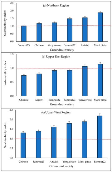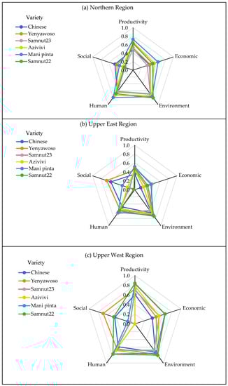 With regards to the improved groundnut varieties, the late maturing varieties showed consistent higher scores for the productivity, economic, environment, and human domains compared with the early maturing varieties across the three regions (Figure 3). In contrast to the above domains, the early maturing groundnut varieties had higher scores for the social domain than the late maturing varieties (Figure 3). Generally, across the three regions, the late maturing varieties had higher sustainability indices than the early maturing varieties (Figure 4). The sustainability indices for Yenyewoso (early maturing) and Mani pinta (late maturing) groundnut varieties were consistently above 1 in all the regions (Figure 3).