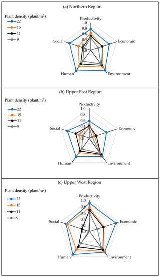 The plant density showed different scores under the five sustainable intensification domains. Planting groundnut, irrespective of the maturity type, at a density of 22 plant/m2 recorded higher productivity, economic, environment, human, and social domain scores compared to the other plant densities. On average across the three regions, planting groundnut at 22 plant/m2 increased the productivity domain score by 63% compared with the 9 plant/m2 (farmer practice). This increase could be due to the increase in plant stands per unit area, which resulted in more pods and fodder per unit area. This result is in line with findings of other studies, where increasing the groundnut plant density has increased pod and fodder yields [14,15,30]. Similarly, planting groundnut at a density of 22 plant/m2 increased the economic domain about threefold relative to the farmer practice and this could be due to the increase in the grain yield, which was able to offset the additional cost of production from this treatment. Dominguez-Hernandez et al. [31] reported that the most influential attribute for measuring the sustainability of agricultural technology is the productivity domain, as the yields determine how efficient the production system is utilized, which, in turn, influences other domains. The 31% increase in the environment domain score for groundnut plant density at 22 plant/m2 compared with the farmer practice across the three regions could be due to the early closure of the canopy, which reduces nutrient loss through soil erosion, smothering and preventing weed growth as a result of more plants per unit area. Giayetto et al. [15] also reported that higher groundnut plant density leads to the production of more tinny canopies that close faster to prevent erosion, weed growth, and the interception of more solar radiation. The higher social domain score obtained by 22 plant/m2 relative to the other plant densities was attributed to good plant stand at harvest, reduced weeding frequency, and good yield by both gender groups of the farmers. Although both farmers reported that the first weeding in 22 plant/m2 required a bit more time compared with farmer practice due to the closeness of the plants, they preferred the later to the farmer practice, since it required only one weeding, which gave them ample time to do other important agricultural related activities that coincide with the second weed of groundnut fields during the cropping season.