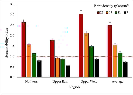 Sustainability index as affected by groundnut plant density in Northern Ghana. Bars represent standard error.