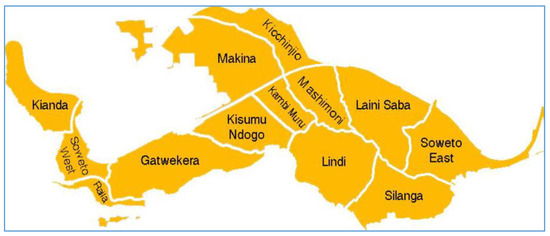 Kibera is one of the largest slums in Africa with an average population of approximately 200,000 people [86,87]. Kibera is located approximately 5 km southwest of Nairobi City centre and stands on 2.5 km2. The slum is divided into 13 villages—Kianda, Soweto West, Raila, Gatwekera, Kisumu Ndogo, Makina, Kicchinjio, Kambi Muru, Mashimoni, Lindi, Laini Saba, Silanga and Soweto East (see Figure 1 below).