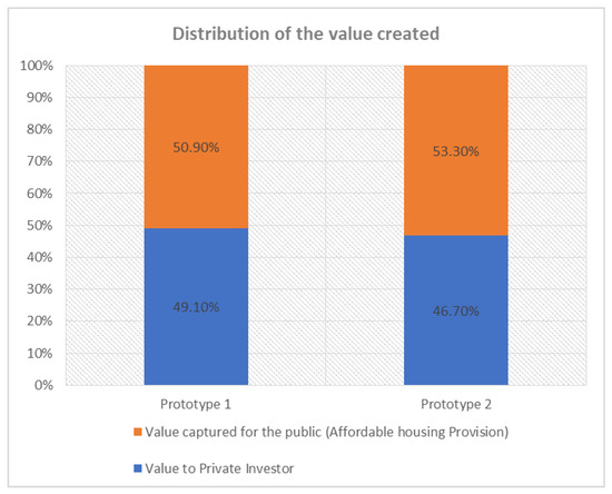 Table 8 and Table 9 show the residual land value analyses for the two prototypes for Soweto East zones C and D. Table 8 shows the residual land value analysis of prototype 1, which is mixed-use. The prototype incorporates a seven-storey plus rooftop development with 43 units (3 shops and 40 residential units). Since most Kibera residents work in the informal sector, provision of shops in some of these developments will be instrumental in supporting livelihoods. Two of the shops are proposed to be availed at affordable rents to Kibera residents and one to be offered at market rent/price. Out of the 40 residential units, 12 units are proposed to be affordable and 28 units are proposed to be market-rate units. Table 9 shows the residual land value analysis of prototype 2, which is purely residential. The prototype also incorporates a seven-storey plus rooftop development with 42 residential units. Out of the 42 residential units, 12 units are proposed to be affordable and 30 units are proposed be market-rate units. Prototypes 1 and 2 result in 27.9% and 28.6%, respectively, of the residential units within the prototype developments being affordable and being fully funded by the private developers and hence the market. This also translates into a 27.9% and 28.6% inclusivity (mix of different income groups) if inclusion is measured by the proportion of affordable units within upgraded developments. Inclusivity was measured in this way in other studies [94].