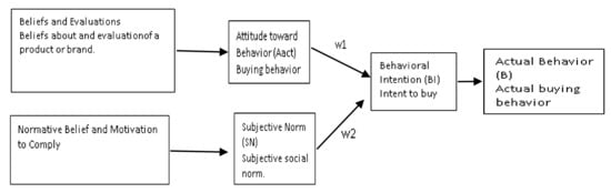 This research applied the theory of reasoned action (TRA) in the context of green consumption [,]. Although the TRA model is old, many consumer survey studies today continue to base their research dimensions and questionnaires on this model, making it a definitive theory [,,,,,]. Adopting the definition of brand equity in the classic literature by Aaker and Keller, this study proposed a consumer green product purchase model which integrated the green marketing, brand value, and green consciousness perspectives, to ensure consistency in the discourse [,,,] with respect to meeting the economic, social, and environmental triple bottom line []. In terms of consumer product buying or brand behavior, the theory of reasoned action model is shown in Figure 1.