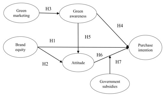 Green products refer to products that are harmless to humans or animals, and cause less harm to the environment compared with conventional products which can be designed to be reused, disassembled, and remanufactured, or its materials can be recycled, reducing with minimum environmental impact than other products [,]. The refurbished smartphone strives to protect or enhance the natural environment by conserving energy and/or resources and reducing or eliminating use of toxic agents, pollution, and waste, therefore, we can define refurbished smartphones to be green products. Since the launch of the America’s Apple iPhone in 2007, the frequency at which new generations of smartphones are introduced has increased. The number of discarded or idle smartphones is increasing steadily each year. To solve the problem of discarded smartphones, this research adopts a previous definition of green products to include refurbished recycled products [,], which perform just as well as new products. In terms of the entire supply chain, the process of recycling, component purchasing, refurbishing, and remanufacturing for used smartphones involves numerous evaluations and precise and eco-friendly production processes. An eco-friendly company can build consumer trust that the brand and its products are reliable and trustworthy, and then increase the consumer’s intent to buy green products. By focusing on green marketing and implementing green value chains, companies with good brand equity can increase their environmental performance and competitive advantages with less environmental harm during the process from design to production. Furthermore, environmentally unfriendly products will gradually disappear from the market. Therefore, consumers’ intent to consume will facilitate or prompt companies to launch green products that both satisfy customer needs and increase environmental awareness, thereby promoting the environment, economy, and society [,,]. Empirical studies show that of the 40% of consumers who are willing to buy green products, only 4% purchase green products which remain extremely low [,]. To understand the factors influencing consumers’ purchase of green products, this research aims at exploring the following six topics: (1) the impact of green marketing on consumers’ green awareness; (2) the impact of green awareness on consumers’ intent to buy green products; (3) the impact of government subsidies on relationship of consumers’ attitude and intent to buy green products; and (4) the direct impact of green attitude on consumers’ intent to buy green products; (5) the impact of brand equity on purchase intention; (6) the impact of brand equity on attitude.