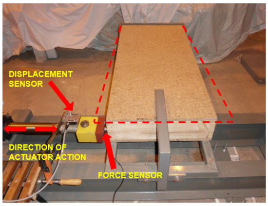 The test frame and research element are shown in the images below in Figure 1, Figure 2, Figure 3 and Figure 4. During experimental tests, both models were subjected to harmonic excitations. The tests were carried out at the frequency of 2 Hz for different values of displacement amplitude. The exerted force was recorded by a KMM40 force sensor. The resulting displacement was measured by an optoNCDT 1302 laser displacement sensor. The force sensor was mounted to the end of the actuator’s moveable rod, while the displacement sensor was installed onto the actuator’s shaft (see Figure 2).
