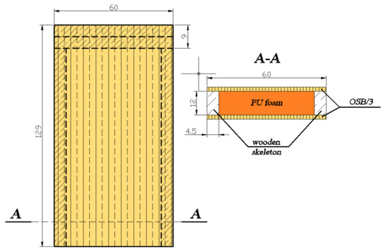 The model’s geometry was based on the test specimen and was 60 cm in width, 120 cm in height, and 18.1 cm in thickness. The outer frame was modeled with shell elements with a thickness of 45 mm on the sides and bottom and 90 mm on top, representing a double layer of beams. The insulation (PU foam) and the sheathing were also modeled as shell elements with a thickness of 18 mm for each OSB panel (covering both sides of the frame) and 145 mm for the insulation made of PU foam. Figure 1 presents the initial model. Figure 5 presents all three materials and the corresponding elements separately. Numerical models were created from a number of composite structural elements consisting of shell elements—one representing the wood frame and three representing three layers (two external simulating OSB sheathing and an internal one simulating PU foam). These three layers were fully connected one to another in the case of the panel with PU foam, representing the situation when the PU foam is injected inside OSB sheathing and it bonds wooden elements together. It should be noted that using beam elements for the outer frame was not possible, because this would not allow the use of three different layers (i.e., two outer layers of sheathing and one internal layer of foam, as presented in Figure 5).