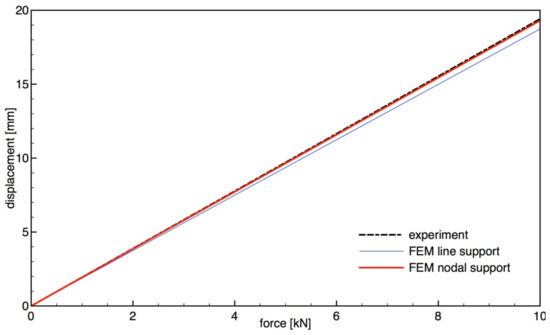 The displacement and resulting force relationship in the experiment and the two different support configurations—line support as presented in Figure 1 and nodal support as visible in Figure 2—are presented in Figure 6. It turned out that no further adjustments were required in order to achieve a convergence in the results for a static load. It also can be seen that the difference between these two support types is basically neglectable.