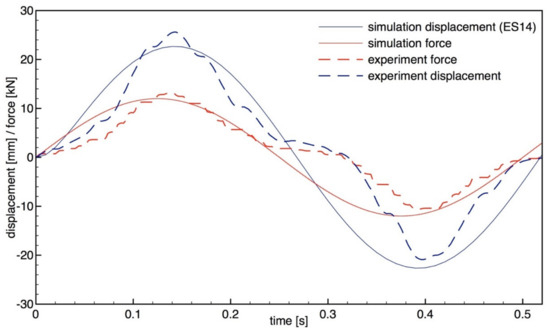 In order to use the numerical 3D model for advanced dynamical tests, it was necessary to verify its dynamical behavior and compare the response of the numerical model with the response of the tested specimen. We chose a frequency of 2 Hz because it was close to the eigenfrequency of the specimen. The results of this comparison—where a sine load at 2 Hz was applied to the specimen in the form of a nodal force—are presented in Figure 7. It should be kept in mind that for using the numerical model to carry out numerical simulations of whole structures like buildings, the most important criteria are the maximum displacement as well as the response frequency. It can be seen from Figure 7 that the numerical results are smoother compared to the real-world test. This can be accepted since the maximum values are close enough, the difference is less than 12% (which can be accepted for engineering design), and the possibility of using numerical models for advanced simulations with accurate maximum displacements makes up for the inaccuracy in the time curve.