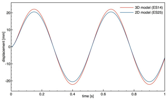 The computation time for these elements subjected to a 4 s dynamical non-linear analysis could be reduced by replacing the 3D model of seven elements with the 2D one-element model, from 44 s to 22 s (measured manually)—a reduction of 50%. This not only saves computation time but also the space (memory) required for analysis and results. The reduction of required RAM can increase the performance of calculations for models of growing size by far more than 50%. Sometimes this can even be necessary to be able to carry out an analysis because a larger model might be too resource-demanding for calculations to be possible on a regular workstation (computer).