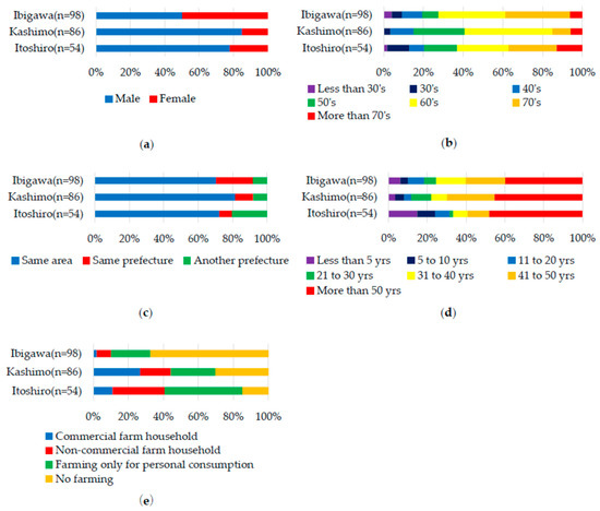 The respondents’ profiles are summarized in Figure 1. More than 75% of the respondents were male in Itoshiro and Kashimo; 78% in Itoshiro and 85% in Kashimo. The male and female rates were equal only in the Ibigawa area. This difference was also likely due to the survey method. In the Itoshiro and Kashimo areas, the questionnaire was delivered to each household and completed by the head of the household, who, in Japan, is traditionally the oldest man in the household. In contrast, each household in the Ibigawa area was visited directly, and the respondent was not always the head of the household.