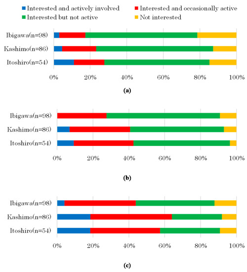 The responses regarding environmental awareness of such topics as domestic energy issues, local environmental issues and regional promotions are shown in Figure 2. The most frequent answer to the question regarding domestic energy issues was “interested but not active” in all three areas; the rates were 57% (Itoshiro), 64% (Kashimo) and 61% (Ibigawa). The proportion of “not interested” residents was highest in Ibigawa (21%).