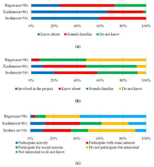 The rate of participation (participate actively + participate with some interest + participate for social reasons) was highest in Kashimo, at 62%, followed by Itoshiro at 50%. It was lowest in Ibigawa at 13%. Although the rates of recognition and participation were low, the response “do not participate but interested” was chosen by fewer than 30% of respondents in Ibigawa.