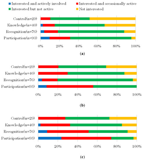Environmental awareness in each category of involvement with small hydropower projects: (a) Domestic energy issues; (b) Local environmental issues; (c) Regional promotion.