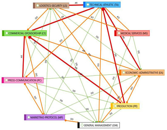 Finally, it is important to stress that the Technical–Athletic area has the most frequent, as well as the most intense, relationships. It is constructed as the central area of the event, something demonstrated by one of the interviewees’ comments: “The Technical–Athletic management is the core of the competition. All of the other functions come from it.” This area is therefore a priority to which special attention must be paid in order to ensure that the event is well run.