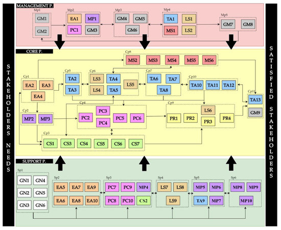 According to the ISO 9001:2015 Standard of the International Organization for Standardization, a process is a set of related activities that transform inputs into desired outputs. Process management is thus a mode of analysis and continuous improvement of the main activities and fundamental elements of organizations [40]. A process-based approach involves focusing on the processes instead of functional areas, and this helps us to achieve a more holistic systematic view [41]. Process management facilitates the monitoring of the dependencies and interrelationships of organizational processes in order to obtain greater final efficacy and efficiency. Process management can also promote the efficient use of resources, leading the organization to more sustainable actions [42]. Applying process management requires us to define processes and operations, and to establish the relationship among them. For Benner and Tushman [43], process management is composed, first, of ‘mapping’. That is, the first and most important step is to identify the processes and situate them on the process map, in order subsequently to use the map as a guide for establishing improvements. According to Anjard and Diego [44], the process map is a visual aid that serves to represent processes to show how tasks, inputs, and outputs are linked. The process map also classifies the processes into three types based on their temporal importance/urgency, on whether they require more or less attention, and on the quantity of resources to be allocated. Processes are divided into management, core and support processes. Management processes control the organization’s strategies and objectives, and are associated with top management. Core processes seek to deploy the policies and strategies, and are associated with middle management. Finally, support processes are not directly related to policies or strategies, but influence the development of operations, and they support the core processes by offering resources [45,46].