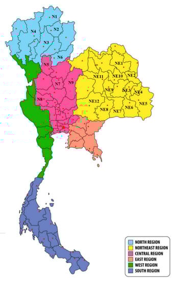 The studied organic rice is Hom Mali rice (KhaoDawk Mali 105), which is the main organic rice cultivated in Thailand. The method used for the LCA study followed the guidelines laid out in ISO14040 and 14044 [,]. The goal of this study was to assess the potential life cycle environmental impacts from expanding organic rice farming (160,000 hectares) []. The studied areas (Figure 1) covered the land areas identified by the Department of Land Development that are suitable for rice cultivation, located in 9 provinces in the North (N) and 12 provinces in the Northeast (NE), namely: N1 (Maesai, Mueang, Pan, Mae Lao, and Chiang Sean districts, Chiang Rai province, Thailand), N2 (Dok Kham Tai, Baantoon, and Hong Hin districts, Phayao province, Thailand), N3 (Thoen and Mueang districts, Lampang province, Thailand), N4 (Mae Dang and Mae Rim districts, Chiang Mai province, Thailand), N5 (Keereemat and Ban Dan Lan Hoi districts, Sukhothai province, Thailand), N6 (Hat Kruat, Thasao, Hat Song Kwae, and Wang Din districts, Uttradit province, Thailand), N7 (Bang Mun Nak, Wachira Barami, Pho Thale, and Pho Prathap Chang districts, Phichit province, Thailand), N8 (Thap Than and Swang Arom districts, Uthai Thani province, Thailand), N9 (Mueang and Si Thep districts, Phetchabun province, Thailand), NE1 (Wanon Niwat, Waritchaphum, and Pang Khon districts, Sakon Nakhon province, Thailand), NE2 (Mueang and Don Tan districts, Mukdahan province, Thailand), NE3 (Kut Chum, Kho Wang, and Pa Tiu districts, Yasothon province, Thailand), NE4 (Mueang and Hua Ta Pan districts, Amnat Charoen province, Thailand), NE5 (Trakanphuetphon, Muang Samsip, Det Udom, Mueang, Khemmarat, Sam Rong, and Phibunmangsahan districts, Ubon Ratchathani province, Thailand), NE6 (Sikhoraphum and Khu Kan districts, Sisaket province, Thailand), NE7 (Chumphon Buri, Sikhoraphum, Chomphra, and Kap Choeng districts, Surin province, Thailand), NE8 (Chalerm Prakiat and Nongki districts, Buriram province, Thailand), NE9 (Mueang and Borabue districts, Maha Sarakham province, Thailand), NE10 (Mueang and Nakhu districts, Kalasin province, Thailand), NE11 (Waeng Yai, Phon, and Samsoong districts, Khon Kaen province, Thailand), NE12 (Phimai, Prathai, Bua Yai, and Sung Noen districts, Nakhon Ratchasima province, Thailand).