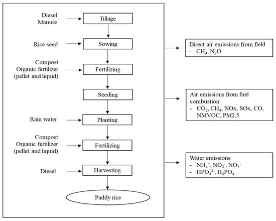 The system boundary in this study was defined as the organic rice product system based on cradle to farm gate, covering the field preparation activities (tilling, sowing, and fertilizing), the cultivation period (seeding, planting, and fertilizing), and the harvesting (Figure 2). The main rice species cultivated is jasmine rice, with the local name of Khao Dawk Mali 105 (KDML 105). The crop production cycle was 120 days. Agricultural machines (i.e., tractors) were used for land preparation (land excavation) and the petrol used for tractors was taken into account []. The organic rice seeds were mainly sourced from the local rice seed division, Department of Rice. For some provinces, the organic rice seeds were produced by a group of local farmers who were trained by the local rice seed division of the Department of Rice on the rice seed production and farming practices. These groups of farmers would provide their seeds to the farmers who grew the paddy rice, with a commitment to give the paddy rice back to the seed producers at the ratio of 1:3 (seed to paddy rice) at the harvesting time. Most of the rice fields in the North are within irrigated zones, whereas the rice fields in the Northeast totally rely on rainfall. During the cultivation period, organic fertilizers were added periodically, and biological extracts made from vegetable and fruit wastes were applied, if needed. Harvesting machines were generally used, but a proper cleaning system was required. The petrol used for harvesting machines was also considered []. After harvesting, the straw was usually incorporated into the soil together with manure for nutrient management to prepare a good soil quality for the next crop. Thus, there was no allocation in this case, and all environmental impacts were totally allocated to the paddy rice. The effect of straw management and soil quality on GHG emissions was beyond the scope of this LCA. The soil carbon in rice fields was also not included in the study, as rice has been planted in the region for a long time and, hence, no major changes were anticipated. The unit of analysis was set as 1 ha of organic rice cultivation to facilitate the comparison of environmental performances based on land use from the policy perspective.