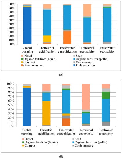 Figure 3 shows the contribution analysis results of organic rice paddy production in the North (A) and the Northeast (B). The GHG emissions, especially from field emissions of methane, were the main contributor to the impact on global warming for both regions (93% for the North, and 91% for the North East). In the North, the use of fertilizers (especially organic fertilizer (pellet)) was identified as the key contributor to environmental impacts, which contributed to 86% in terrestrial acidification, 98% in freshwater eutrophication, 68% in terrestrial ecotoxicity, and 94% in freshwater ecotoxicity. In the Northeast, the use of fertilizers (mainly organic fertilizer (pellet) and compost) also highly contributed to terrestrial acidification (80%), freshwater eutrophication (88%), and freshwater ecotoxicity (81%). The use of diesel for agricultural machinery contributed substantially to terrestrial ecotoxicity (61%).