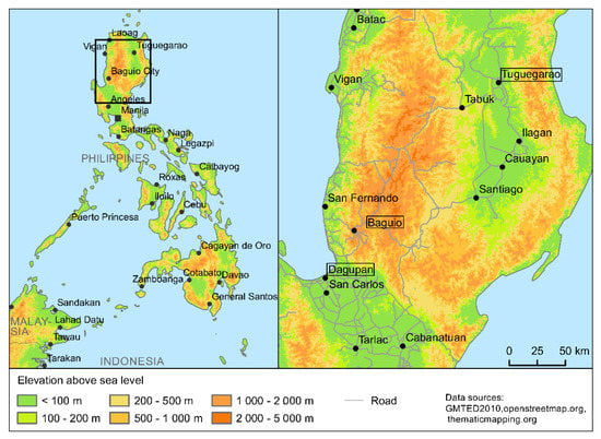 The study was conducted in three cities on the Philippine Island of Luzon, namely Baguio, Dagupan, and Tuguegarao (see Figure 2). Criteria for choosing the cities under study were different climatic and geographical conditions as well as access to local resources through the project partners involved from the ICLEI Southeast Asia Secretariat. To allow a better understanding of the cities under study, we provide some basic information regarding their geography, climate, and trends in mean temperature and precipitation (see Table 2). Trends were calculated based on data from the Philippine Atmospheric, Geophysical and Astronomical Services Administration (PAGASA). Additionally, representatives from the administrations of the three cities provided qualitative information on climate change-related risks during a stakeholder workshop in 2012 [48].