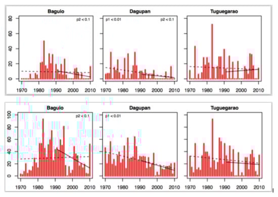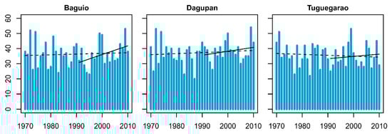 Strong rain: We defined a strong rainfall event as a day on which rainfall exceeds the 90th percentile in the period of observation. The dotted (continuous) lines in Figure 5 show the linear trends for the periods 1970–2010 (1991–2010) (data source: PAGASA). Years with more than 30 missing values have been excluded. A total of 69.5% of all respondents perceived an increase in the frequency of heavy rain events (between 63.8% in Tuguegarao and 73.2% in Dagupan). For the period of 1991–2010, weather station data corroborate this perception regarding all three cities (see Figure 5). For Baguio and Dagupan, this is also the case for the period of 1970–2010, whereas for Tuguegarao, an upward trend for the period of 1970–2010 can only be seen when looking at heavy rain events above the 99th percentile (not pictured).