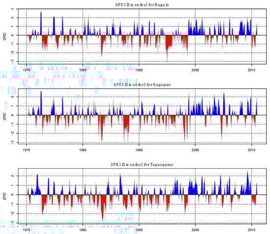 Standardized Precipitation Evapotranspiration Index SPEI for three-month periods for 1970–2010. Values above 0 represent phases with positive climatic water balance; values below 0 represent phases with negative climatic water balance, i.e., drought periods [45] (data source PAGASA).