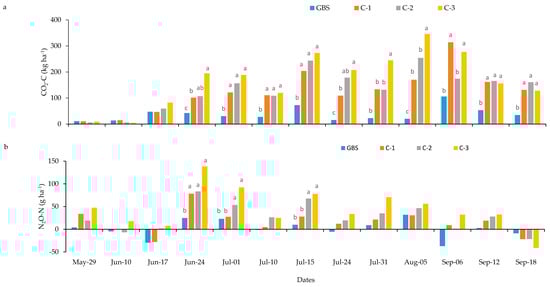 Greenhouse gas emissions varied among the treatments, and it was higher during summer and fall for all the treatment plots, as shown in Figure 5a, than in the GBS. Grass buffer strip treatment had the lowest cumulative CO2-C emission (4.83 Mg ha−1), and the emission increases with distance from the grass edge in the corn strip from C-1 to C-3, as shown in Figure 6a. Among the sampling locations within the corn strip, C-3 had the highest total emissions of CO2-C and was 35.3% higher than C-1 and 34.4% higher than C-2.