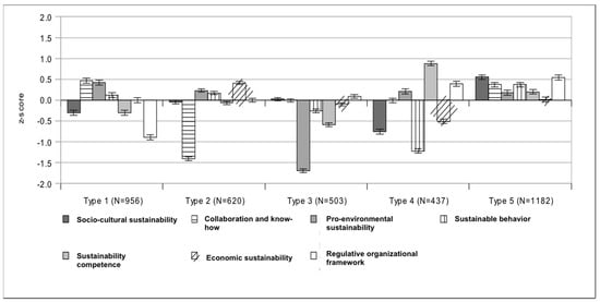 This type considers “sustainability competences” and a “regulative organizational framework” critical for university life. However, this type perceives “sociocultural sustainability” and “economic sustainability” negatively and “sustainable behavior” as significantly negative. Type 4 is represented among male as well as female teachers around the age of 30, mainly at the University of Graz; moreover, this type is represented mainly within the discipline of the humanities.