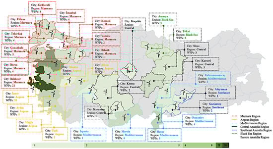 The map of the wind power plants’ locations in Turkey’s 6 out of 7 physiographic regions and 30 provinces.