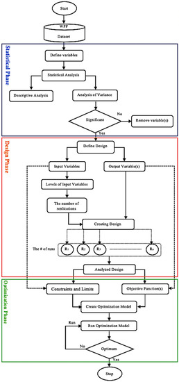 The flow chart in Figure 3 illustrates the phases of the study in detail. There are three main phases to build the methodology of the study, which are statistical analysis, Box-Behnken design of experiment (DOE) and nonlinear optimization model. Each phase constitutes the infrastructure of the next phase.