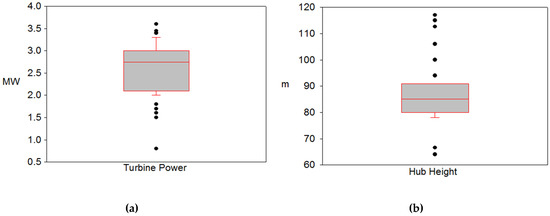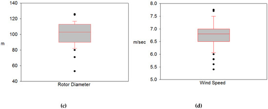 The Box plots of the four factors, namely turbine power, hub height, rotor diameter and wind speed, were generated to visually show the spread of the data set by making use of minimum value, q1 (first quartile), q2 (second quartile or median), q3 (third quartile) and maximum value of each variable. As seen from Figure 4, the data of turbine power are mostly centered in the 1st quartile (2.1 MW–2.75 MW). Similarly, the data of rotor diameter and wind speed are almost concentrated in the q1. However, hub height values are distributed more intensely in the 3rd quartile ranging from 92 m to 117 m. The intervals of quartiles for each factor are tabulated in the design part in detail.