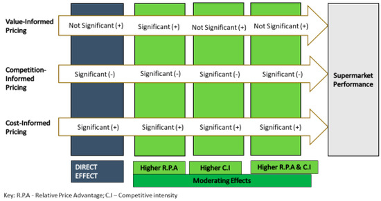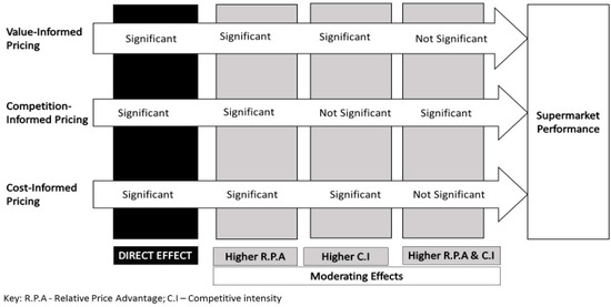 With respect to the product and market contingencies that influence the role of pricing practices on firm performance, relative product advantage and competitive intensity are examined. Firstly, relative product advantage deals with the relative superiority of the supermarket’s product over competition [34]. Relative product advantage has been consistently found to be a strong predictor of organization performance [35]. Competitive intensity relates to the market in which the product is sold [34]. In marketing strategy literature, competitive intensity is seen as a major force that erodes the ability of the firm to reap the benefits of the customer value it creates e.g., [35,36,37].