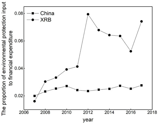 Environmental protection has always been taken seriously in the XRB. The proportions of environmental protection input to financial expenditure in China and XRB are listed in Figure 2 since 2007 [18], which was the year that environmental protection spending began to take into fiscal spending in China. Data are collected from the Ministry of Finance of China and the Bureau of Finance in Huangshan City and Jixi County, which contain the XRB. Although in 2007, the proportions in XRB were greater than those in China. The financial expenditure had significant differences (p < 0.05) before and after 2012, which was the year that ecological compensation began. Thus, we take the period of 2012–2017 as consideration of ecological compensation effects.