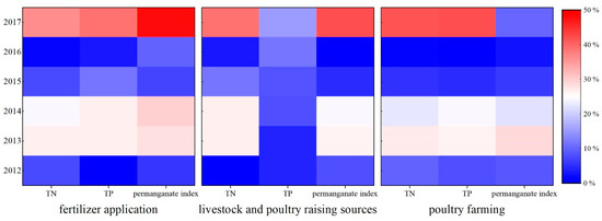 Pollution source apportionment can help in identifying non-point sources as the main pollution sources in XRB. The average source shares of TN loads (industrial point sources/agricultural plantations sources/livestock and poultry raising sources/domestic pollution sources = 1.59/35.90/46.01/16.51) indicated that livestock and poultry raising sources were the predominant nitrogen source (Table 5). After ecological compensation, the proportion of industrial point sources decreased significantly. The reduction of nutrients from point sources in the XRB is important because the effect had instant results.